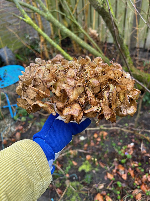 Pääsin myös raivaamaan pihaa. Pelkät katkaistut saniaisten oksat ja hortensian kukinnot täyttivät koko kompostisäiliön. Eivät mahtuneet syksyn lehdet enää. Otan ne sitten ensi viikolla. Toivottavasti silloin olisi kuiva sää, koska nyt oli tullut sadekuuro päältä ja lehdet olisivatkin olleet ällön märkiä. Jo hortensian katkonnasta nahkahanskat tulivat limaisen litimäriksi.